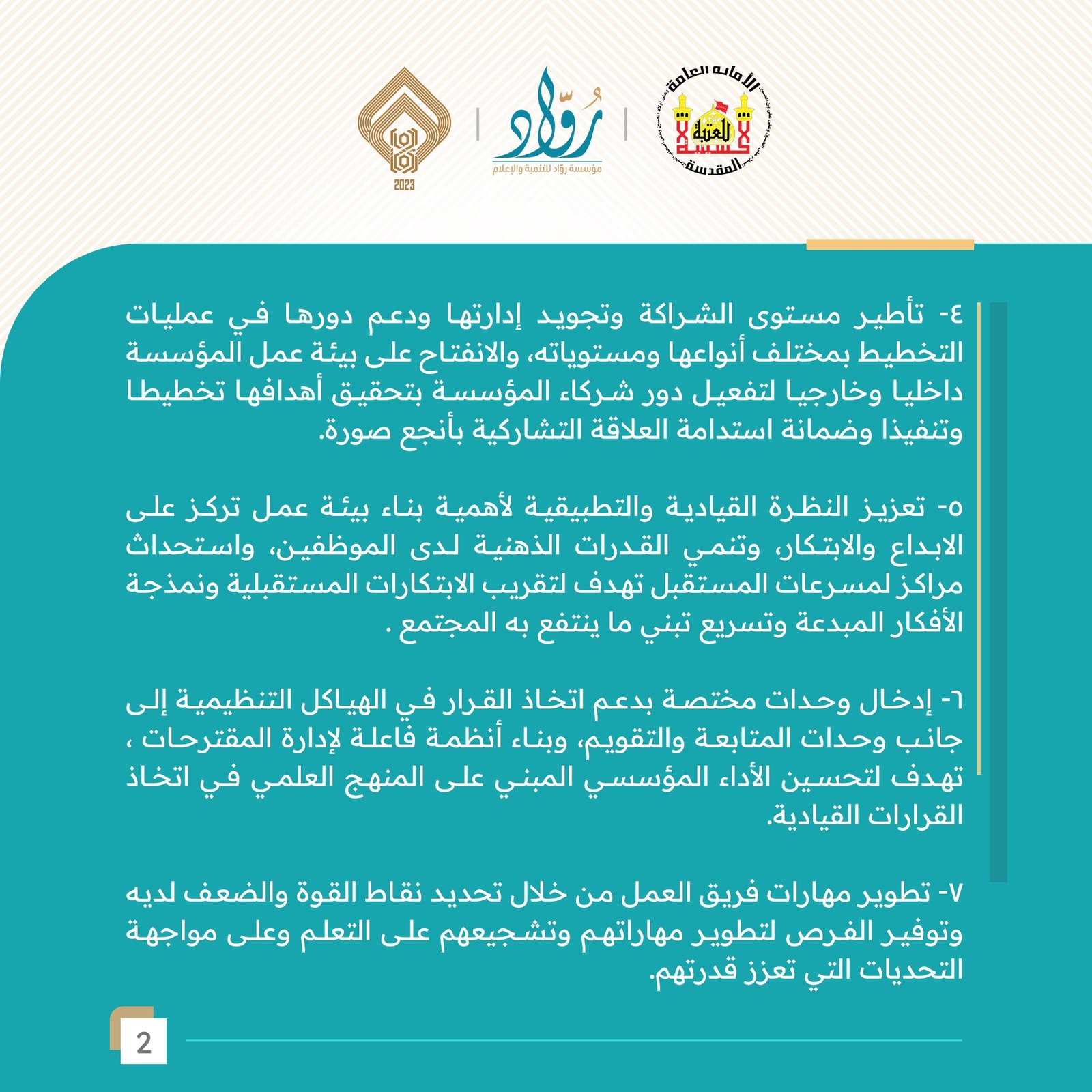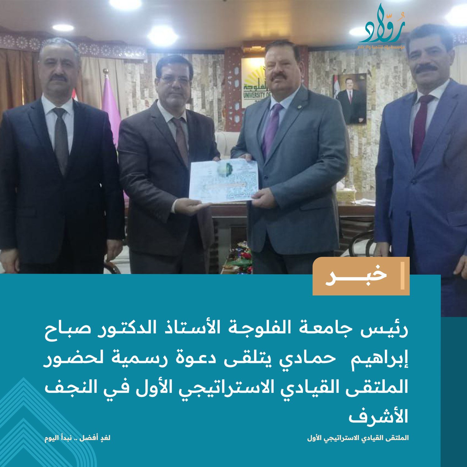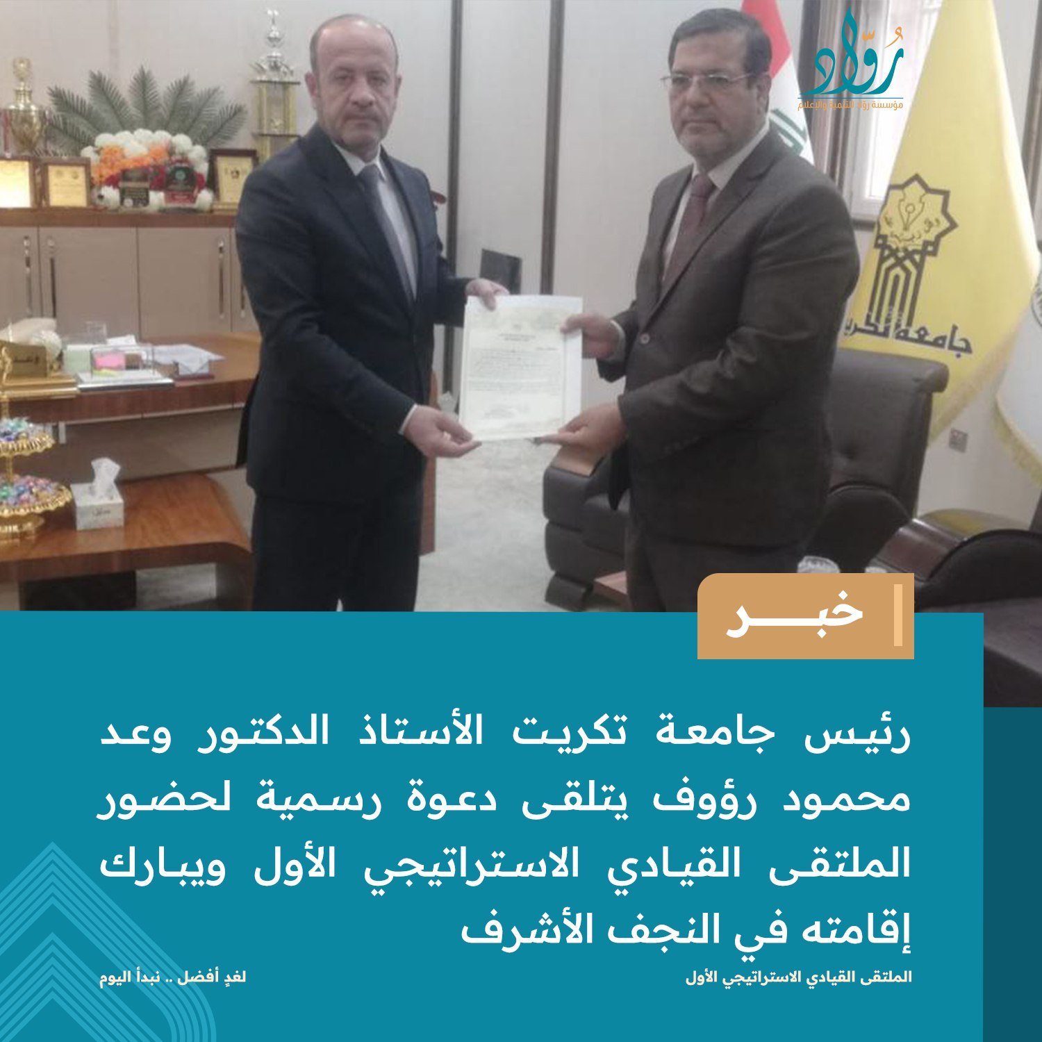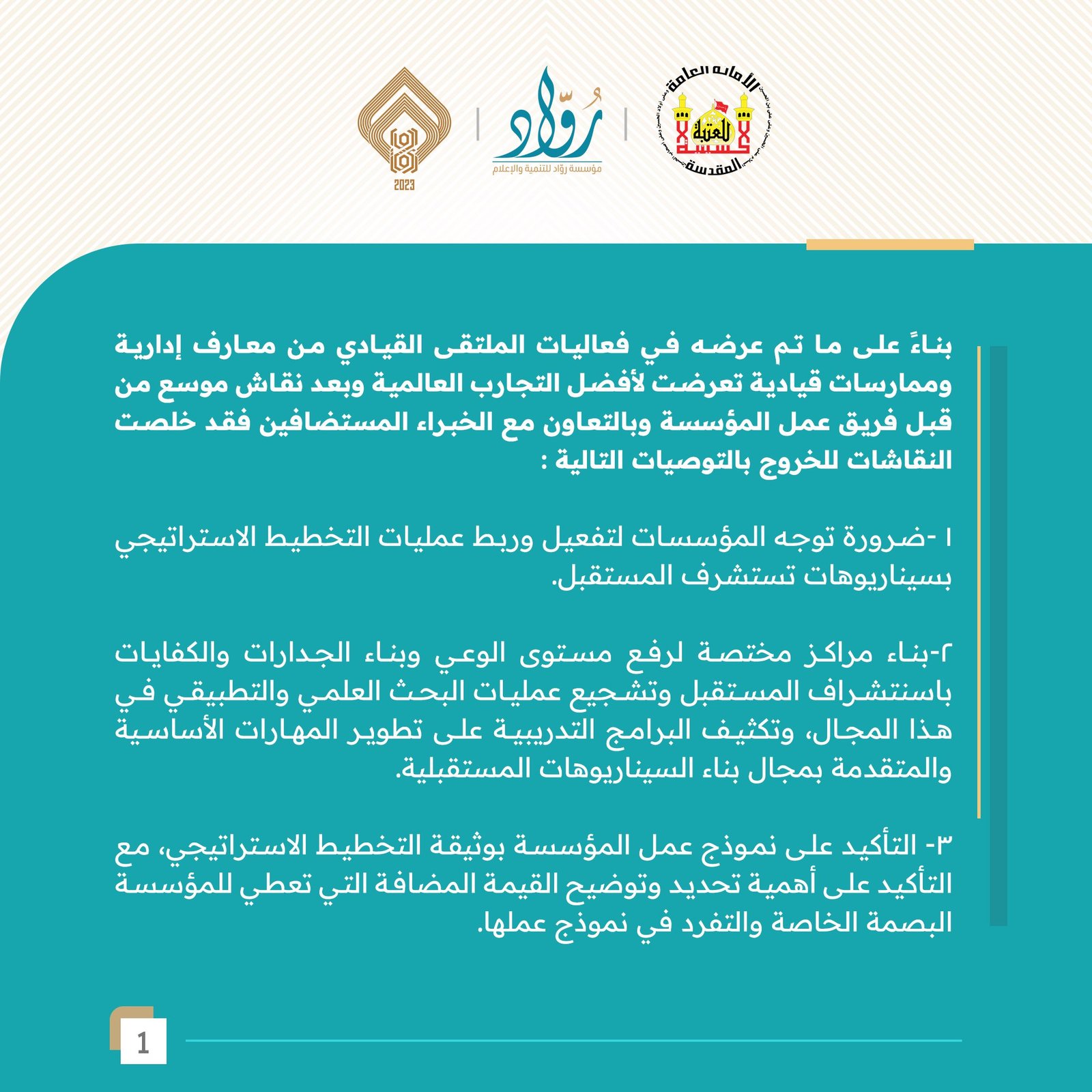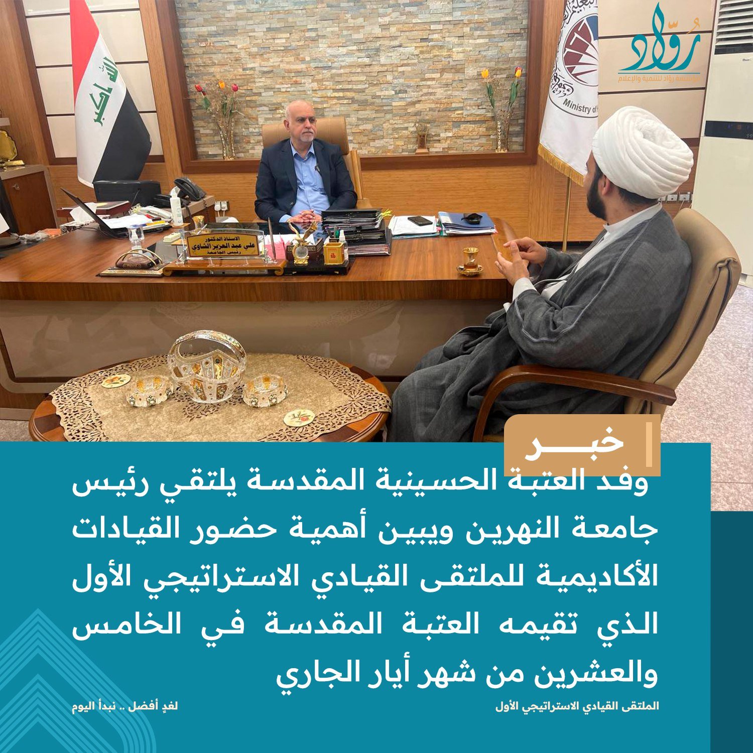في عالم يتسم بالتغير السريع والتحديات المعقدة، برزت الحاجة الماسة للقيادة الاستراتيجية لتوجيه المؤسسات نحو المستقبل بدقة. من هذا المنطلق، نظمت العتبة الحسينية المقدسة، بالتعاون مع مؤسسة "رواد" للتنمية والإعلام، الملتقى القيادي الاستراتيجي الأول في مدينة النجف الأشرف. وقد وُصف هذا الملتقى بأنه خطوة جبارة وفارقة لوضع أسس صحيحة للإدارة الحديثة، وهو من بنات أفكار مؤسسة "رواد". كما اعتُبر حدثاً قيادياً استراتيجياً فريداً من نوعه للعتبات المقدسة في العراق.